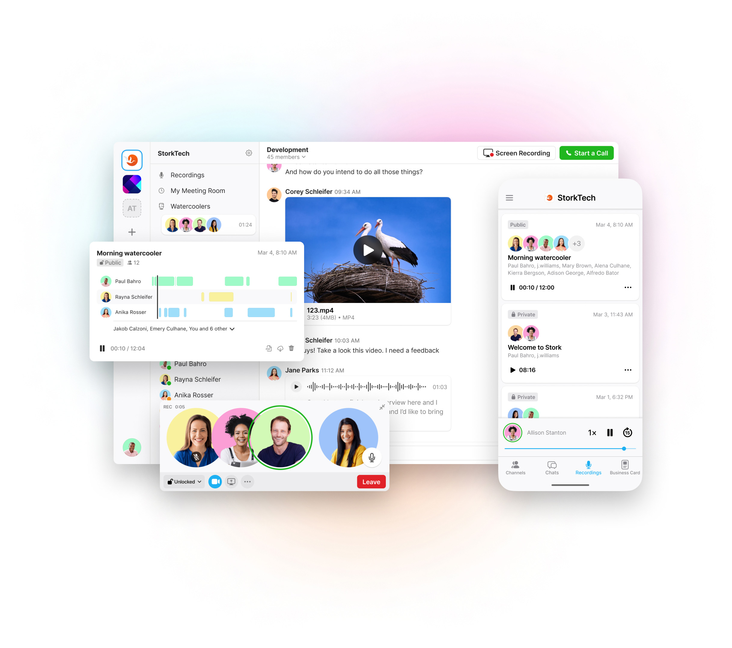 Absence of unexpected office encounters is a real problem for remote teams. Stork is the first and only business platform that solves this. When two people are talking in Stork - any other team member can join the conversation. Stork creates serendipitous meeting experience and encourages spontaneous conversations.
